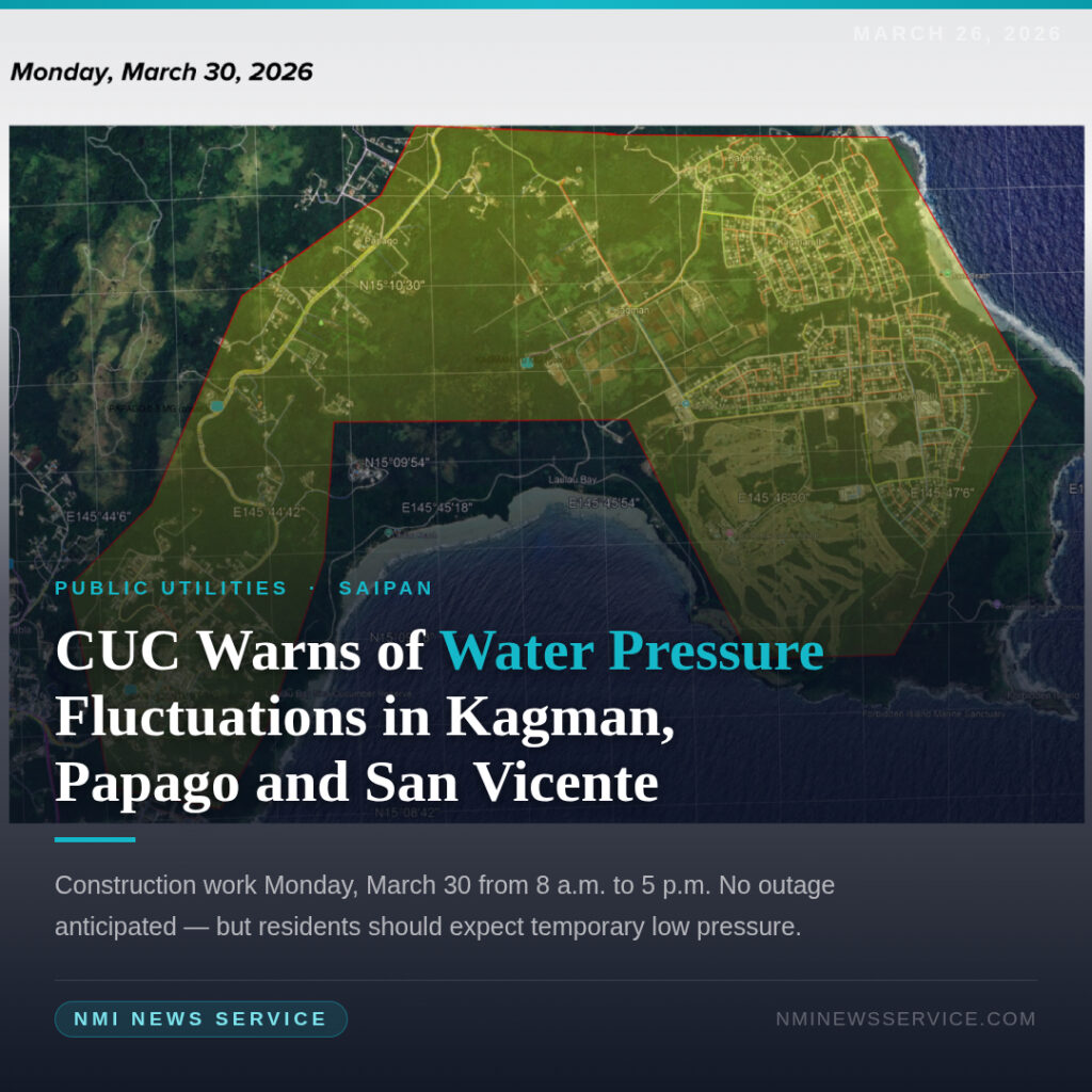 SAIPAN — Residents in the Kagman, Papago and San Vicente Tank Service Areas may experience low water pressure Monday, March 30, as the Commonwealth Utilities Corporation’s contractor performs tapping work for the Kagman 1.0 MG Water Tank Construction Project.