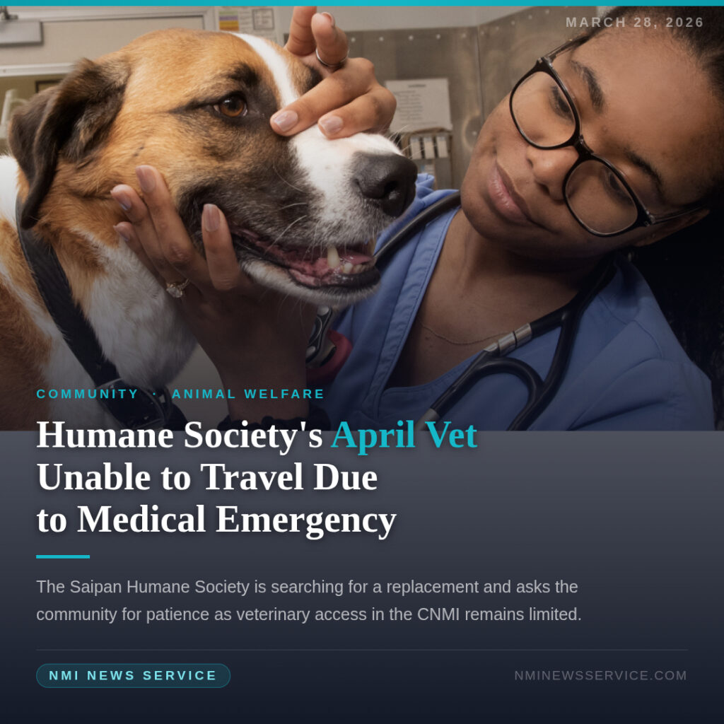 SAIPAN — The Saipan Humane Society announced Saturday that the veterinarian scheduled to provide long-term services in April is no longer able to travel to Saipan due to an unforeseen medical emergency.