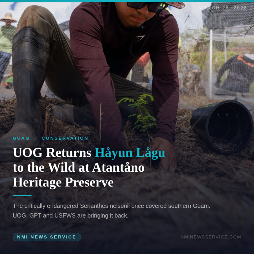 SANTA RITA, Guam — The University of Guam Center for Island Sustainability and Sea Grant, alongside the Guam Preservation Trust and the U.S. Fish and Wildlife Service, hosted an outplanting event at the Atantåno Heritage Preserve in Santa Rita, returning seedlings of the critically endangered Serianthes nelsonii — known locally as håyun lågu on Guam and tronkon guåfi on Rota — to their natural habitat.