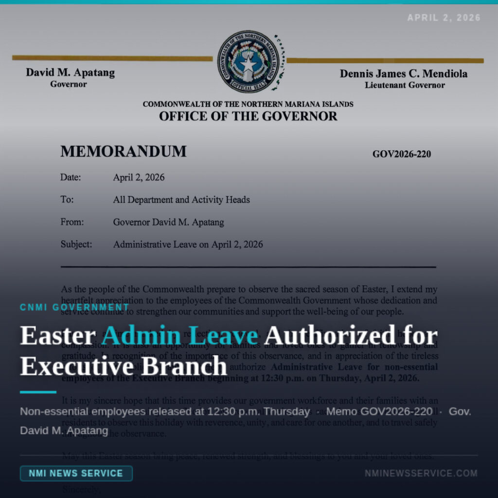 SAIPAN — Governor David M. Apatang authorized administrative leave for non-essential employees of the Executive Branch beginning at 12:30 p.m. Thursday, April 2, in observance of the Easter season.