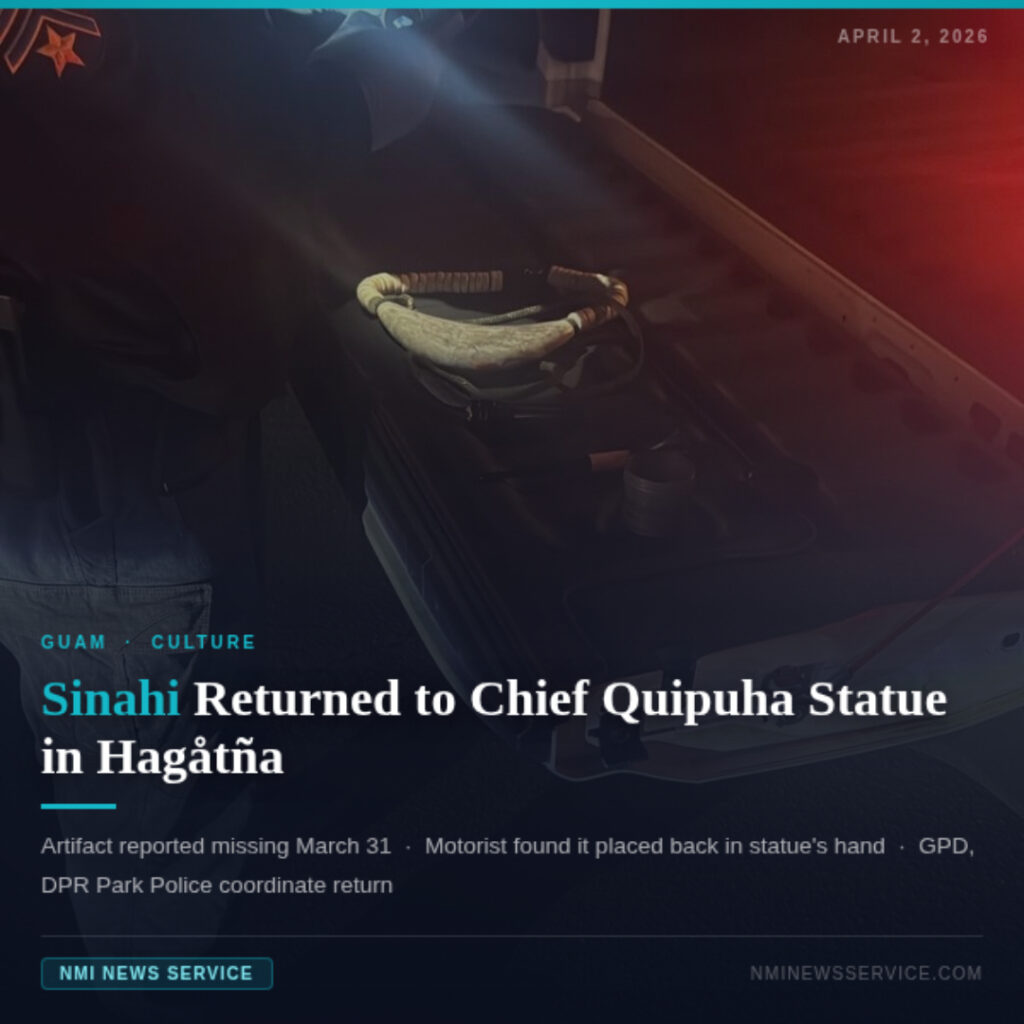 HAGÅTÑA — The sinahi belonging to the Chief Quipuha statue in Hagåtña has been recovered and will be restored to its rightful place, the Office of the Governor confirmed Thursday.