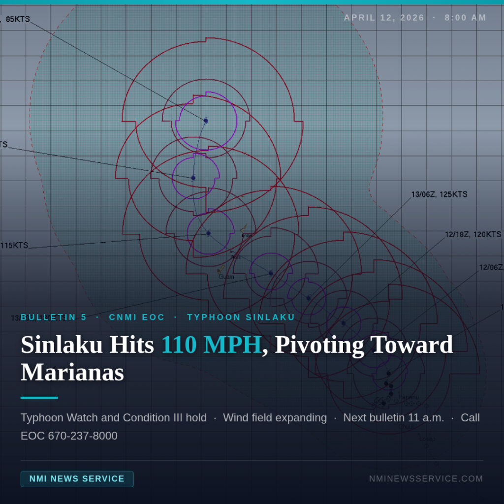 SAIPAN — Typhoon Sinlaku has intensified to 110 mph sustained winds and is pivoting toward the Marianas, the CNMI Emergency Operations Center reported Sunday morning in Bulletin 5 at 8 a.m.