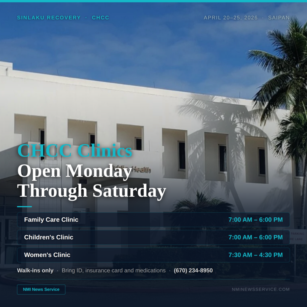SAIPAN — The Commonwealth Healthcare Corporation announced its outpatient clinics will reopen Monday, April 20 through Saturday, April 25. An earlier version of this story incorrectly listed the Women’s Clinic closing time as 5:30 PM. The correct closing time is 4:30 PM.