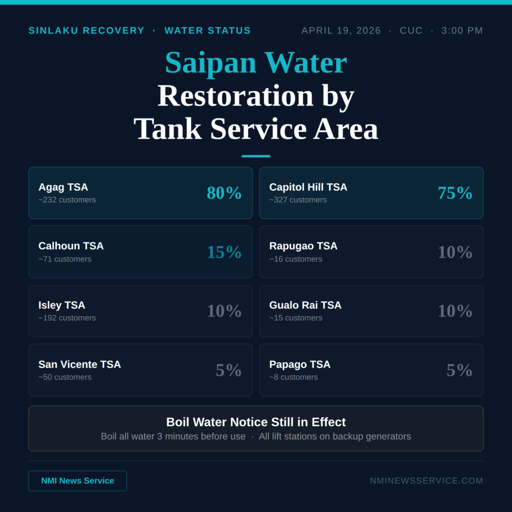 SAIPAN — CUC released a Sunday afternoon snapshot of water restoration progress across Saipan’s eight tank service areas, showing two areas at significant capacity while the remaining six remain at critically low levels.