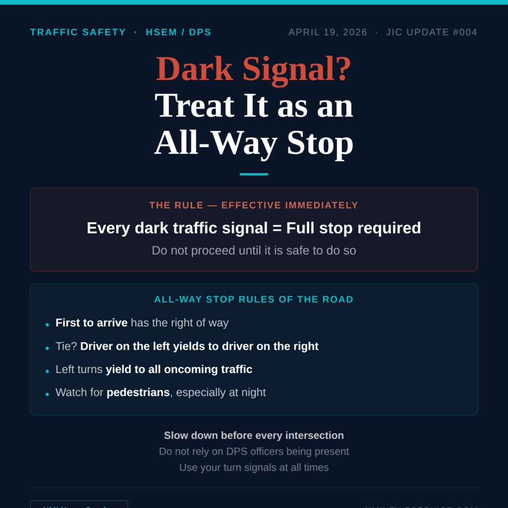 SAIPAN — CNMI Homeland Security and Emergency Management and the Department of Public Safety issued an urgent traffic safety advisory Sunday evening requiring all motorists to treat every dark or non-functioning traffic signal as an all-way stop, effective immediately.