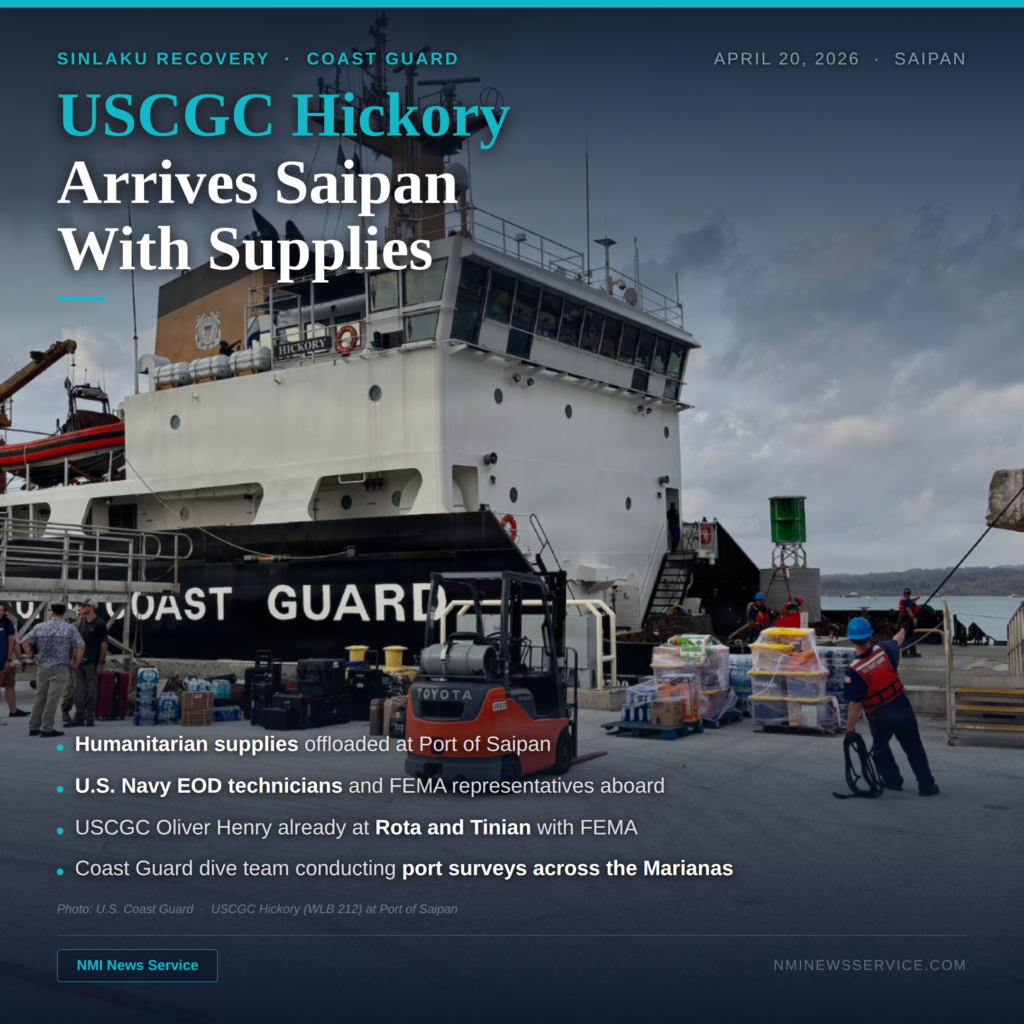 SAIPAN — The U.S. Coast Guard Cutter Hickory is en route to Saipan carrying humanitarian supplies, U.S. Navy explosive ordnance disposal technicians and FEMA representatives, with an anticipated arrival Monday around sunrise, the Coast Guard announced in Recovery Update 2 Sunday.