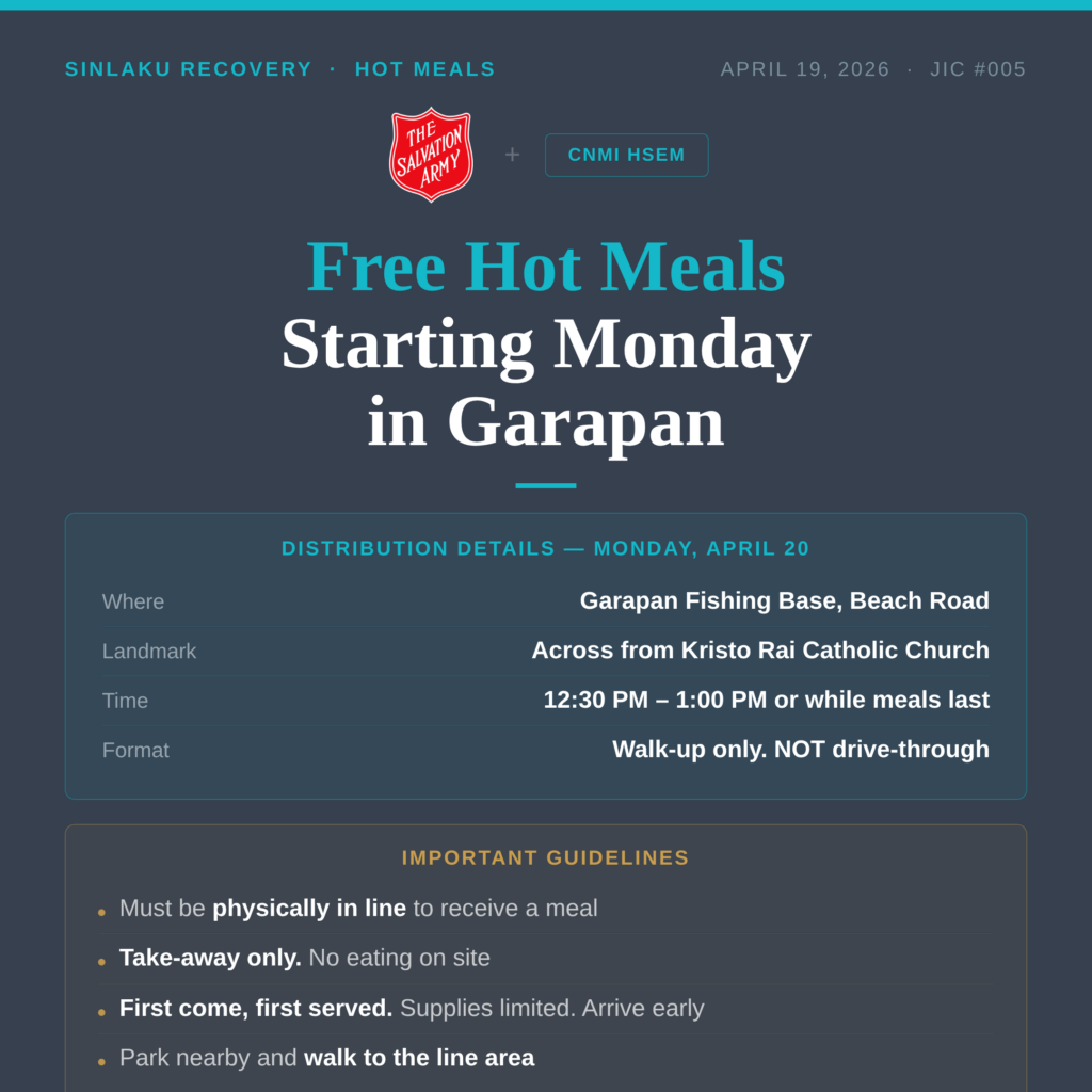 SAIPAN — Free hot meals will be available to the public starting Monday, April 20, as HSEM and The Salvation Army launch mass feeding operations at the Garapan Fishing Base on Beach Road, directly across from Kristo Rai Catholic Church.