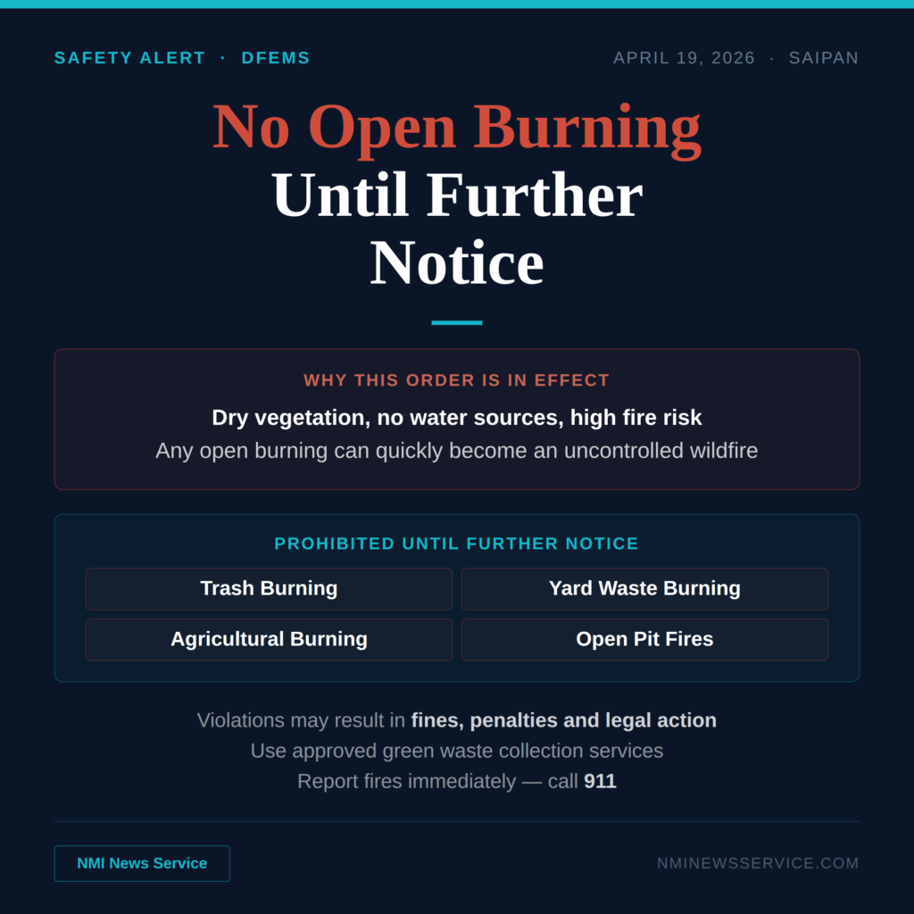 SAIPAN — The Department of Fire and Emergency Medical Services is prohibiting all open burning on Saipan until further notice, warning that post-typhoon conditions have created a serious wildfire risk.