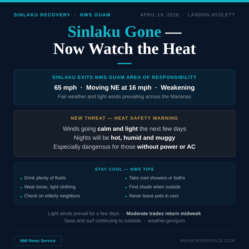 SAIPAN — Tropical Storm Sinlaku has exited the National Weather Service Guam area of responsibility, but forecasters are now warning residents without power to prepare for dangerous heat as winds go calm over the Marianas in the coming days.