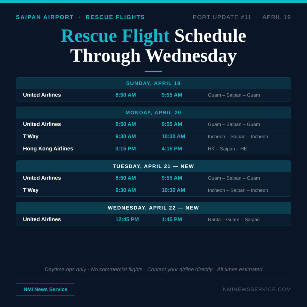 SAIPAN — The Commonwealth Ports Authority has extended the Saipan rescue flight schedule through Wednesday, April 22, adding new flights on Tuesday and Wednesday while removing Philippine Airlines and a tentative United Airlines flight from Monday’s lineup, according to Port Update 11 issued Sunday at 5:02 PM.