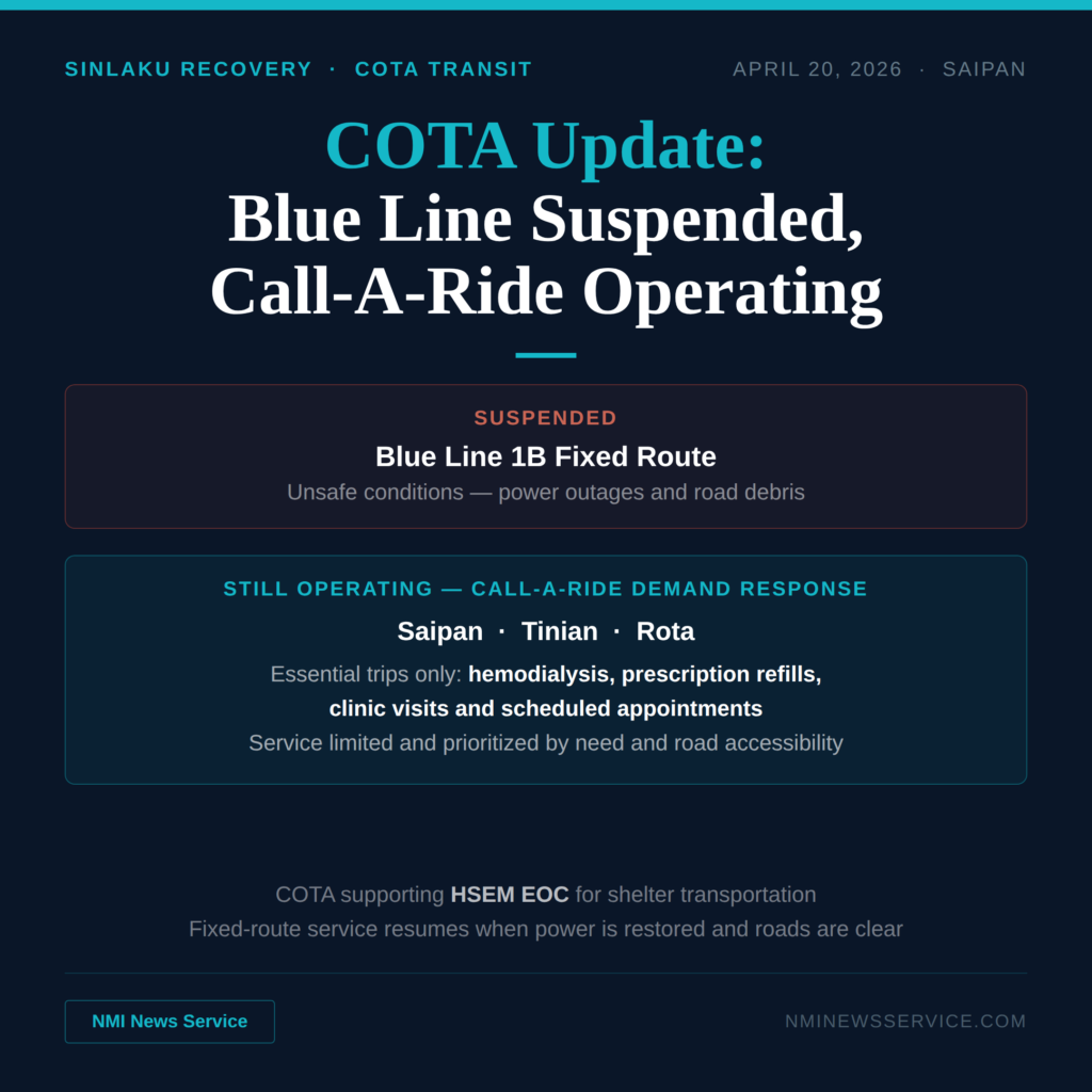 SAIPAN — The Commonwealth Office of Transit Authority has suspended its Blue Line 1B fixed-route service following Typhoon Sinlaku, but Call-A-Ride demand response service remains operating across Saipan, Tinian and Rota for essential medical trips.
