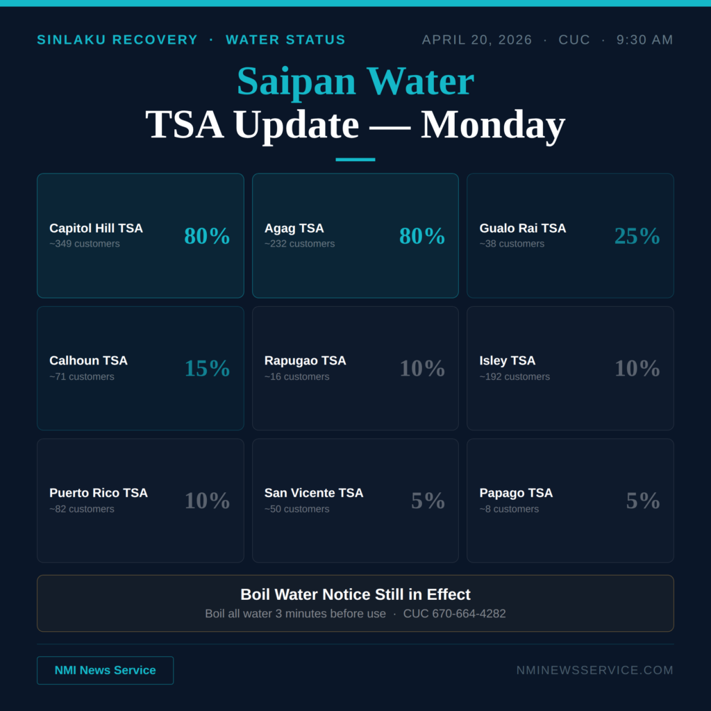 SAIPAN — Capitol Hill Tank Service Area jumped to 80% Monday morning and Puerto Rico TSA appeared on the water restoration map for the first time, according to CUC’s 9:30 AM update.