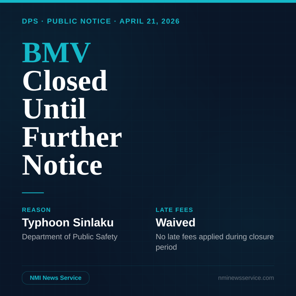 SAIPAN — The Department of Public Safety announced Tuesday that the Bureau of Motor Vehicles will remain closed until further notice due to the impacts of Typhoon Sinlaku. Late fees will not be applied during the closure period.