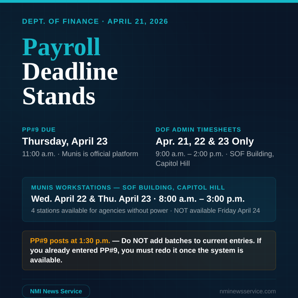 SAIPAN — The Department of Finance is reminding all government agencies that timekeeping for Pay Period 9 remains due Thursday, April 23 at 11:00 a.m., and has set up workstations at the SOF Building in Capitol Hill to help agencies without power or computer access meet the deadline.