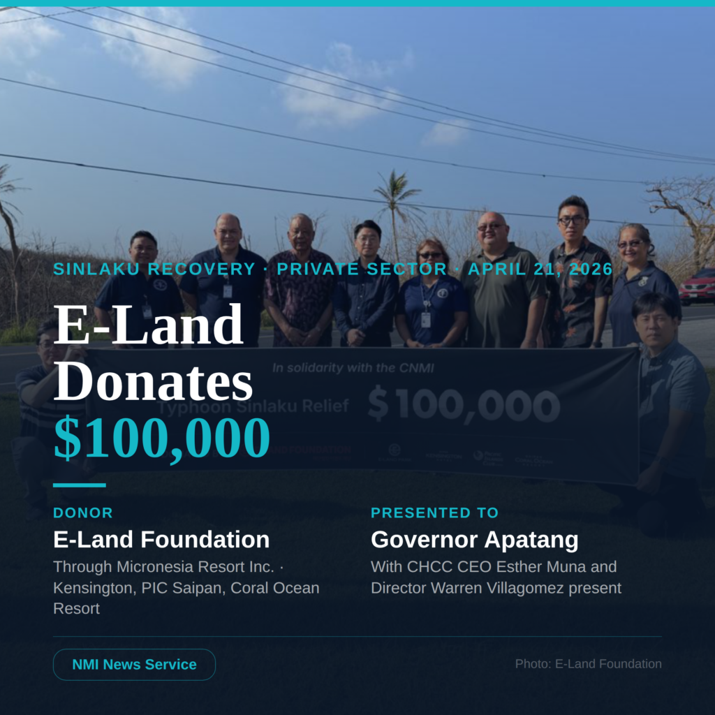SAIPAN — E-Land Foundation announced Tuesday a $100,000 cash donation to support Typhoon Sinlaku recovery efforts in the CNMI, delivered through its subsidiary Micronesia Resort Inc. during a meeting with Governor David M. Apatang and leaders of the Commonwealth Healthcare Corporation.