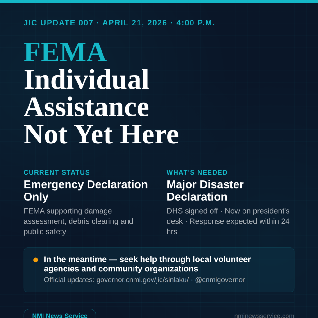 The biggest story of the day: the CNMI’s major disaster declaration request is on the president’s desk. Congresswoman Kimberlyn King-Hinds announced from Washington this afternoon that DHS Secretary Markwayne Mullin has signed off on Governor David M. Apatang’s request. The package is now with President Trump and a response is expected within 24 hours. The governor’s ask includes individual assistance, public assistance with direct federal assistance, hazard mitigation, and a 100 percent federal cost share for debris removal and emergency protective measures across Saipan, Tinian, Rota and the Northern Islands. Kim says she hopes to come home within the next couple of days once it’s signed.