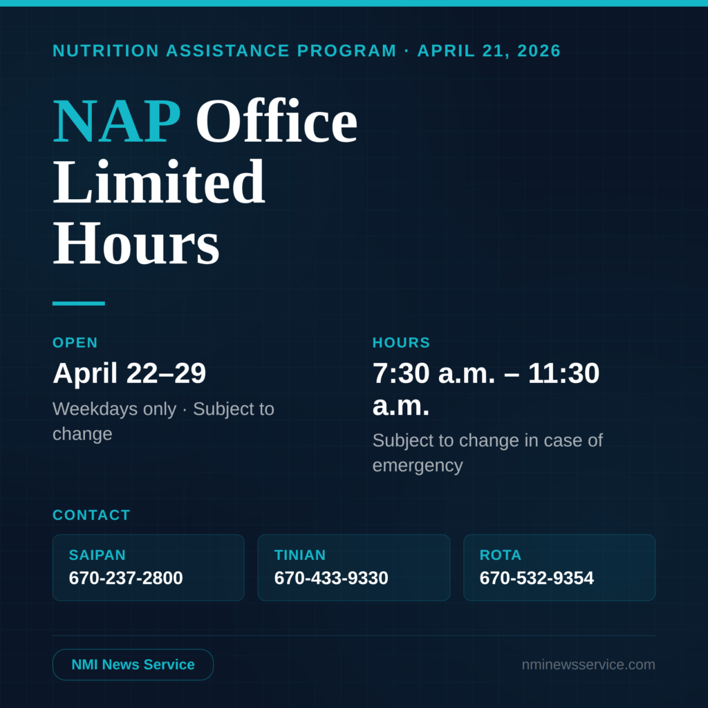 SAIPAN — The CNMI Nutrition Assistance Program office will be open April 22 through April 29, excluding weekends, with limited hours of 7:30 a.m. to 11:30 a.m. Hours are subject to change in case of emergency.