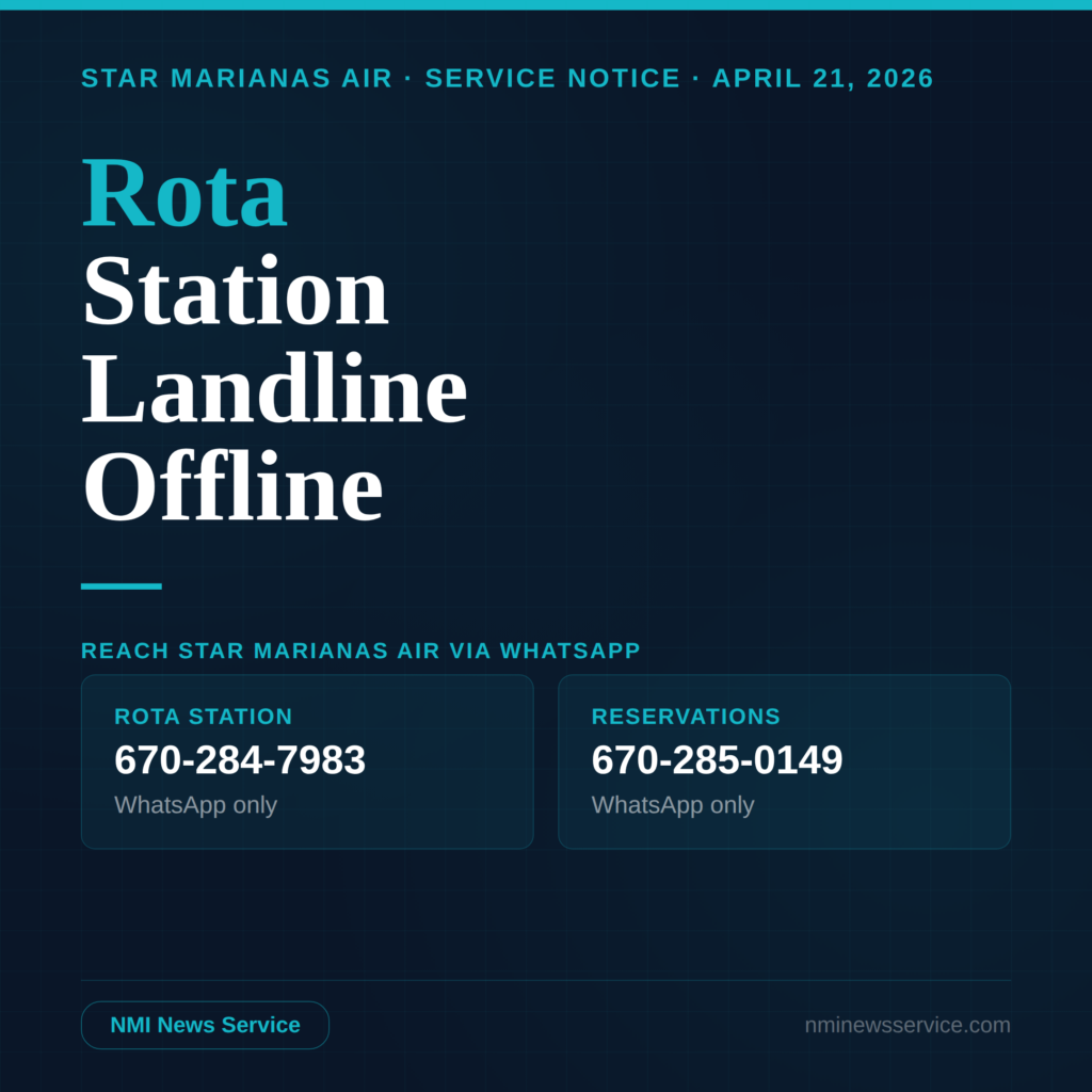 ROTA — Star Marianas Air advises that its Rota Station landline is currently offline following Typhoon Sinlaku. Passengers and those seeking reservations can reach the airline via WhatsApp at the following numbers: Rota Station at 670-284-7983 and Reservations at 670-285-0149.