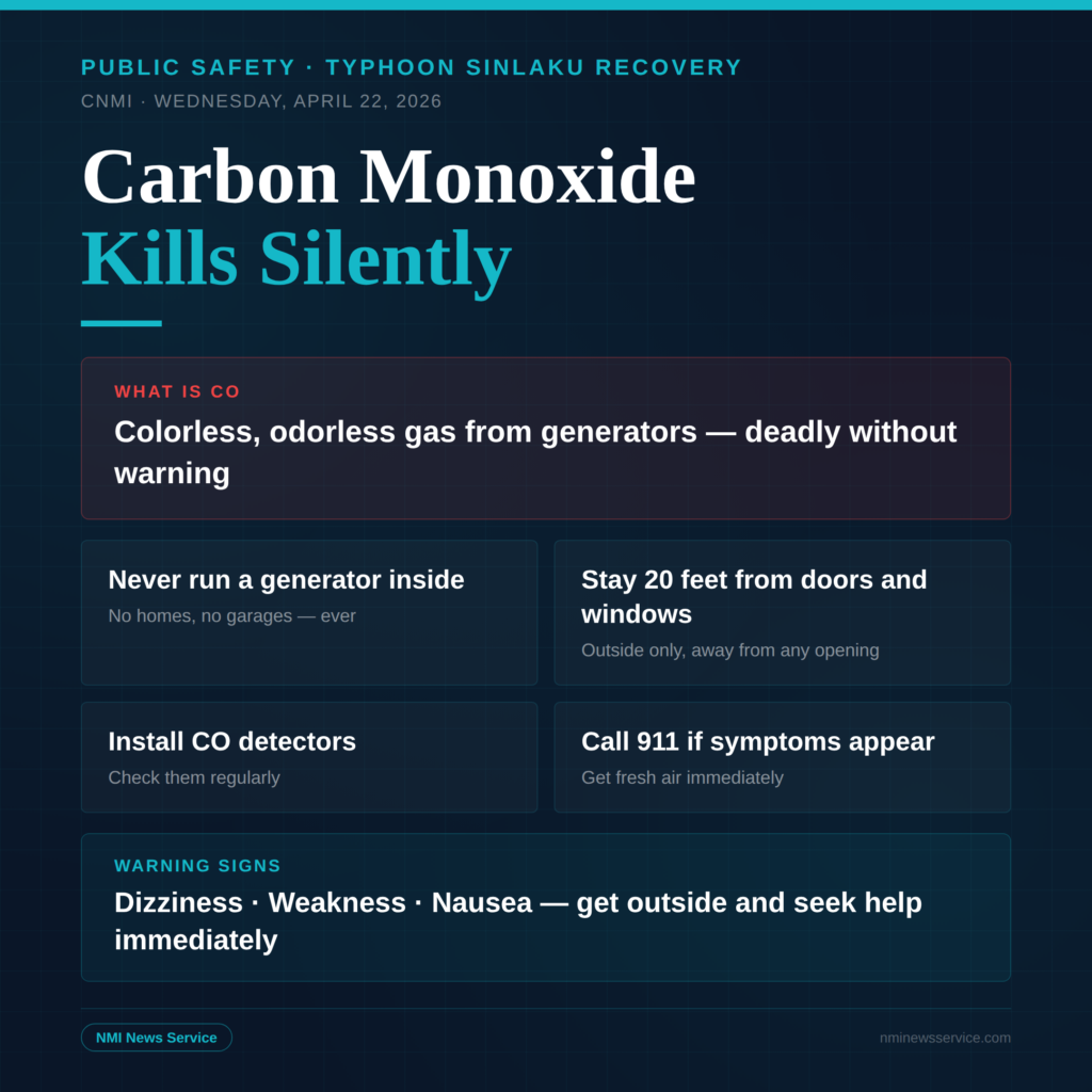 SAIPAN — With thousands of residents relying on generators following Typhoon Sinlaku, the CNMI Joint Information Center is urging the public to take precautions against carbon monoxide poisoning, warning that the colorless, odorless gas can be deadly, often without warning.