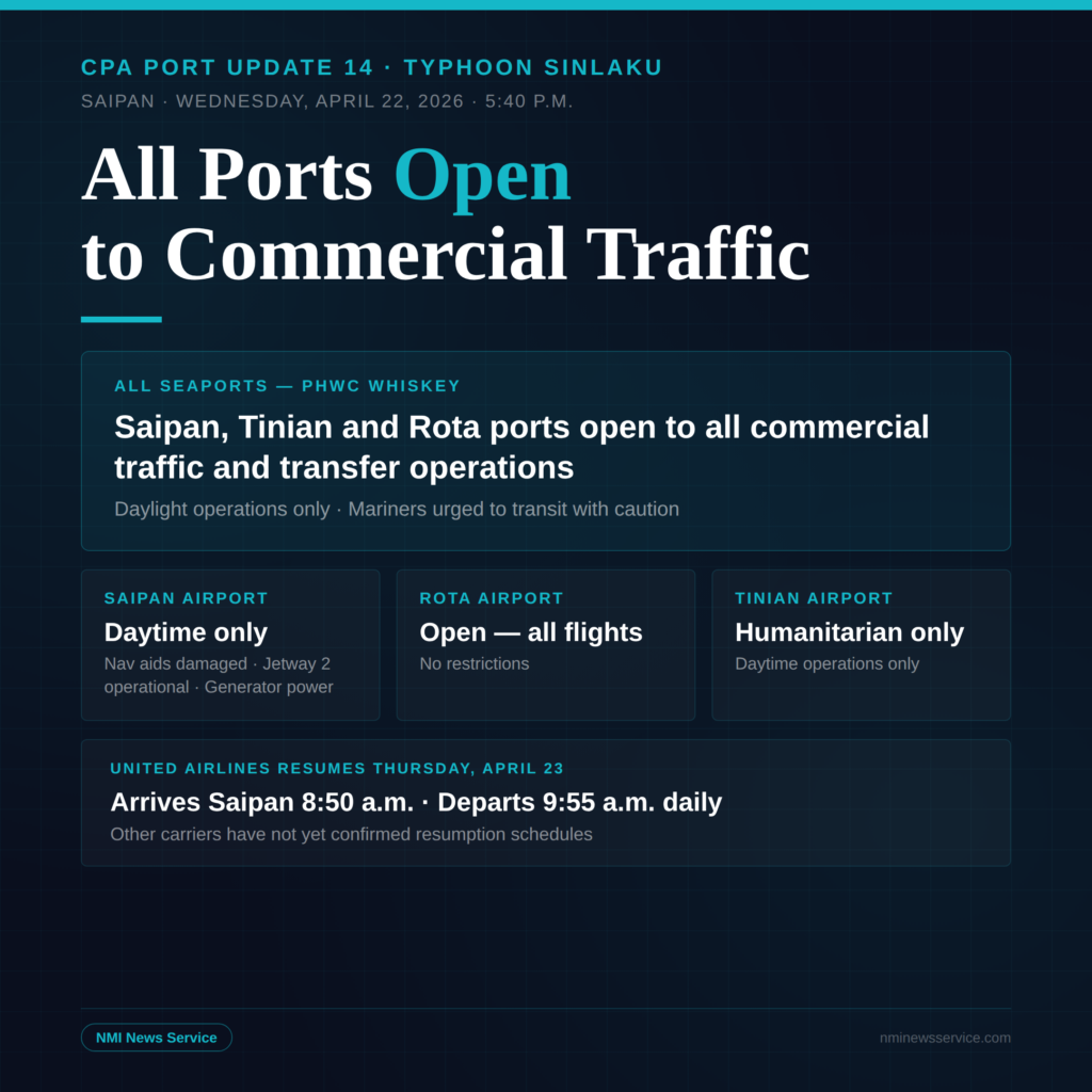 SAIPAN — United Airlines will resume daily service between Saipan and Guam beginning Thursday, April 23, arriving at 8:50 a.m. and departing at 9:55 a.m., according to Commonwealth Ports Authority Port Update 14 issued Wednesday evening. Other airline partners have yet to confirm their resumption schedules.