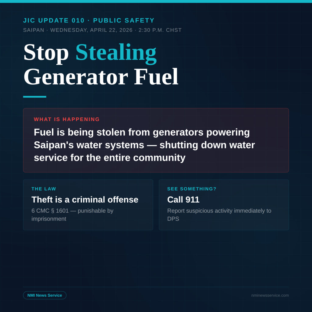 SAIPAN — The CNMI Joint Information Center is warning the public after reports of fuel being stolen from generators powering water systems on Saipan, an act that can shut down generators and disrupt water service to the entire community.