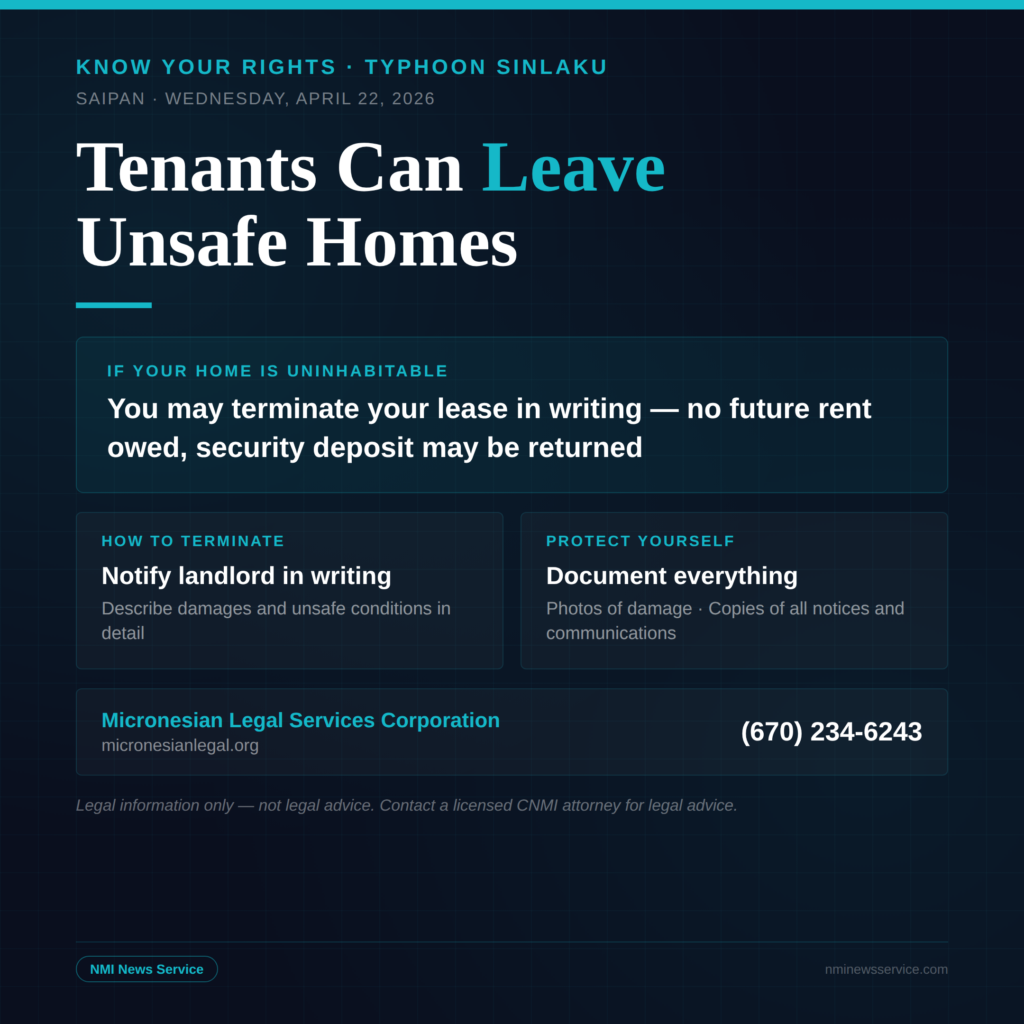 SAIPAN — Micronesian Legal Services Corporation is reminding CNMI tenants that they do not have to remain in homes rendered uninhabitable by Super Typhoon Sinlaku and may be able to terminate their leases without penalty.