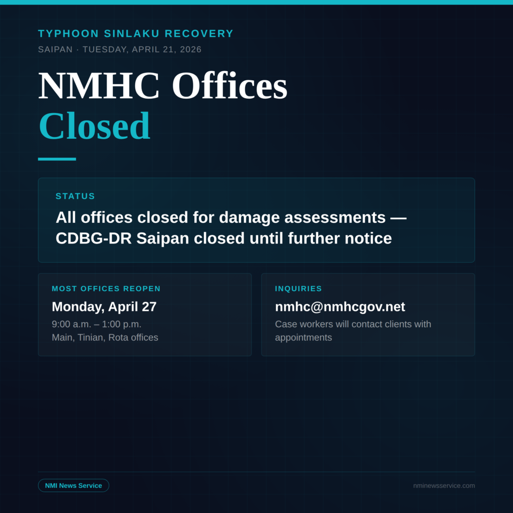 SAIPAN — The Northern Marianas Housing Corporation has closed its main office, CDBG-DR Office, Planning Office and field offices on Tinian and Rota while damage assessments are conducted following Typhoon Sinlaku.