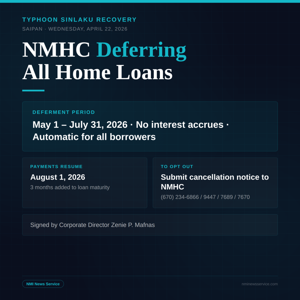 SAIPAN — The Northern Marianas Housing Corporation will defer all home loan payments for three months due to the economic hardships caused by Super Typhoon Sinlaku, Corporate Director Zenie P. Mafnas announced Wednesday.