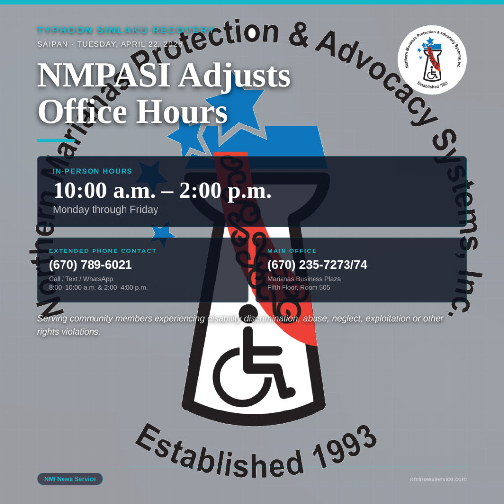 SAIPAN — The Northern Marianas Protection and Advocacy Systems, Inc. has temporarily adjusted its office hours in response to Super Typhoon Sinlaku, with in-person services now available from 10:00 a.m. to 2:00 p.m., Monday through Friday.