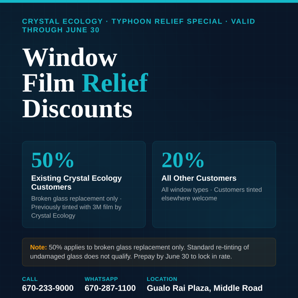 SAIPAN — Crystal Ecology is offering Typhoon Sinlaku relief discounts on 3M window film replacement services through June 30, 2026.
