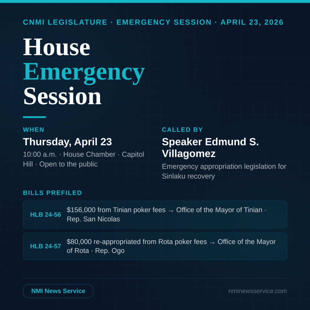 SAIPAN — House Speaker Edmund S. Villagomez has called an emergency session of the Twenty-Fourth Northern Marianas Commonwealth Legislature for Thursday, April 23 at 10:00 a.m. in the House Chamber at the Vice Speaker Jesus P. Mafnas Memorial Building in Capitol Hill to take up emergency appropriation legislation in response to Typhoon Sinlaku.