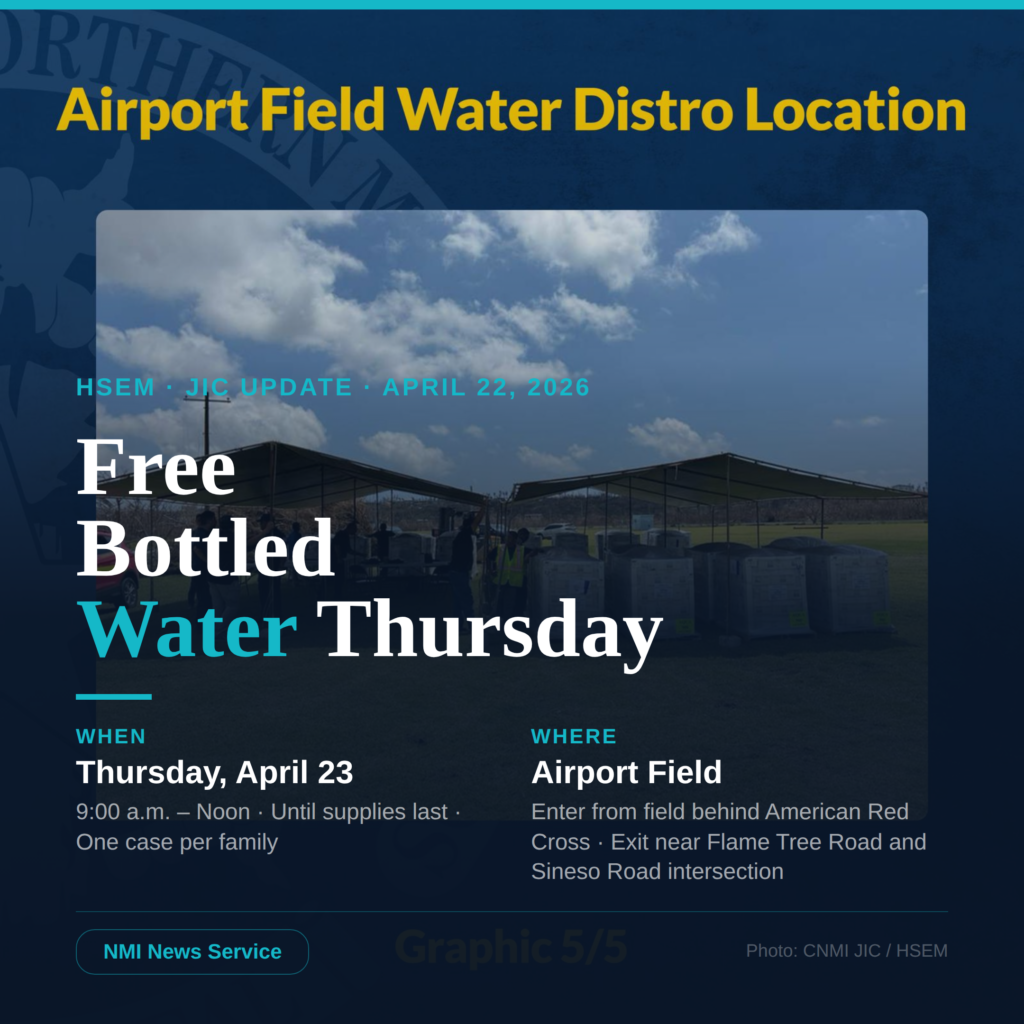 SAIPAN — HSEM and FEMA will distribute bottled drinking water to Saipan residents at the Airport Field beginning Thursday, April 23 from 9:00 a.m. to noon, or until supplies last, according to JIC Update 009 issued Tuesday.
