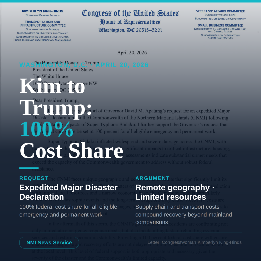 WASHINGTON — Congresswoman Kimberlyn King-Hinds formally wrote to President Donald J. Trump on April 20 urging expedited approval of a Major Disaster Declaration for the CNMI following Typhoon Sinlaku and calling for the federal cost share to be set at 100 percent for all eligible emergency and permanent work.