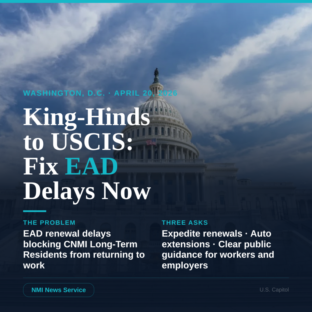 WASHINGTON — Congresswoman Kimberlyn King-Hinds wrote to U.S. Citizenship and Immigration Services Director Joseph B. Edlow on April 20 urging immediate action on stalled Employment Authorization Document renewals for CNMI Long-Term Residents, arguing that documentation delays are creating an avoidable barrier to typhoon recovery at a time when the workforce is critically needed.