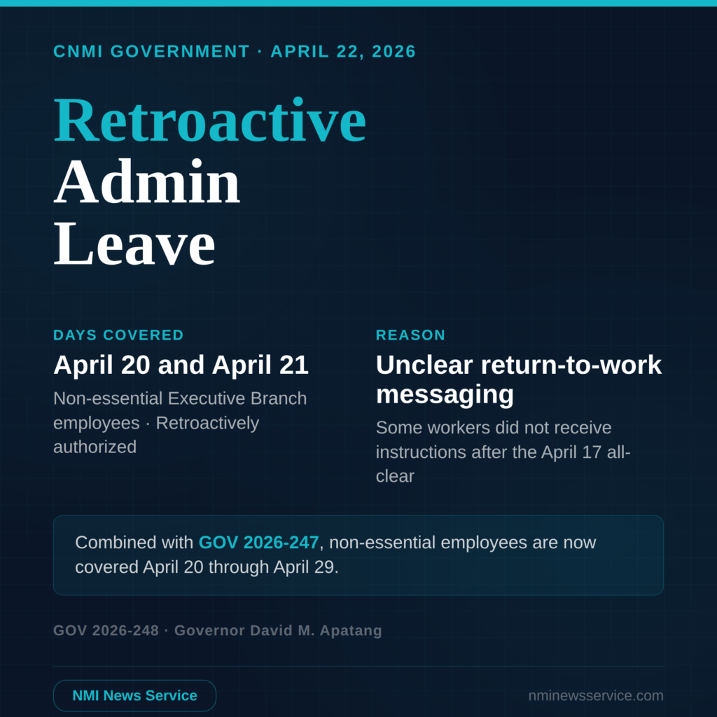 SAIPAN — Governor David M. Apatang has retroactively authorized administrative leave for Monday, April 20 and Tuesday, April 21 for non-essential Executive Branch employees, citing unclear messaging that left some workers without instructions to return to work following the all-clear declaration on April 17.