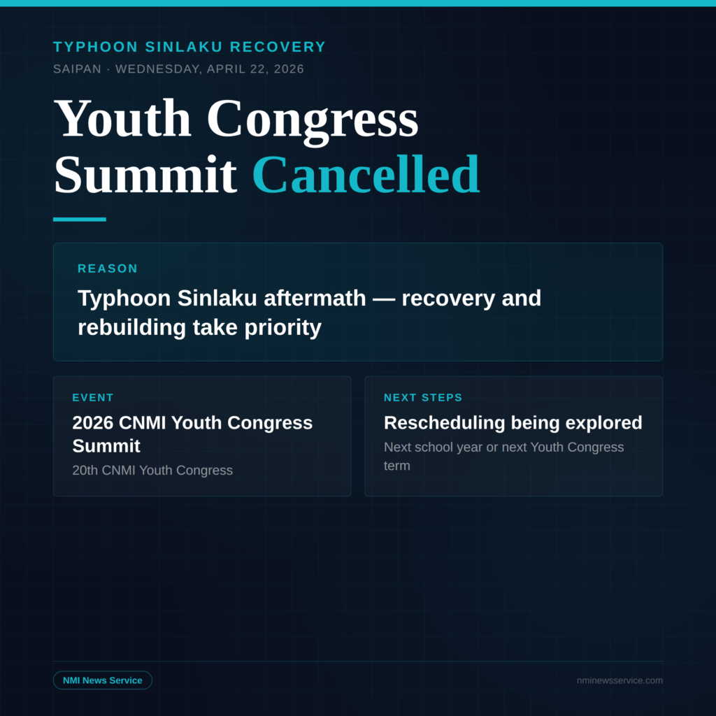 SAIPAN — The 20th Commonwealth of the Northern Mariana Islands Youth Congress has cancelled the 2026 CNMI Youth Congress Summit in the aftermath of Super Typhoon Sinlaku, according to a letter signed by Speaker Sen. Vinnie Juan Sablan and Vice-Speaker Sen. Monique Mendiola.