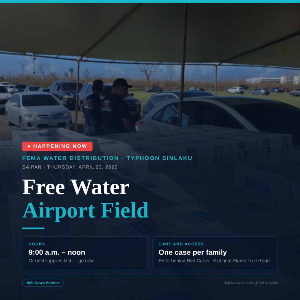 SAIPAN — FEMA bottled water distribution is underway Thursday morning at the Airport Field, with residents lining up to receive emergency drinking water as recovery from Typhoon Sinlaku continues.