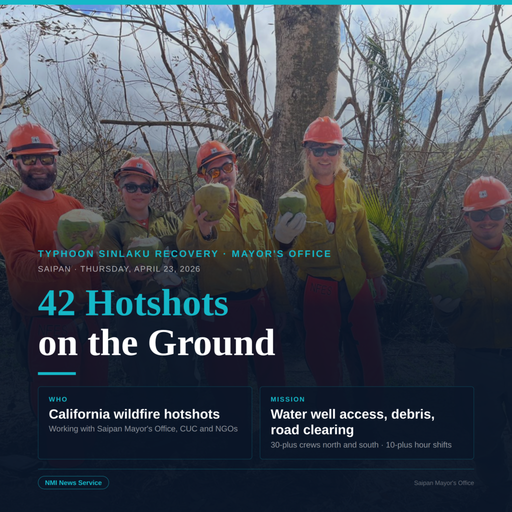 SAIPAN — The Saipan Mayor’s Office has 42 California wildfire hotshots on the ground assisting with debris removal and clearing access to water wells and power infrastructure following Typhoon Sinlaku, Communications Liaison Benjamin Maratita said Thursday in an interview with the NMI News Service