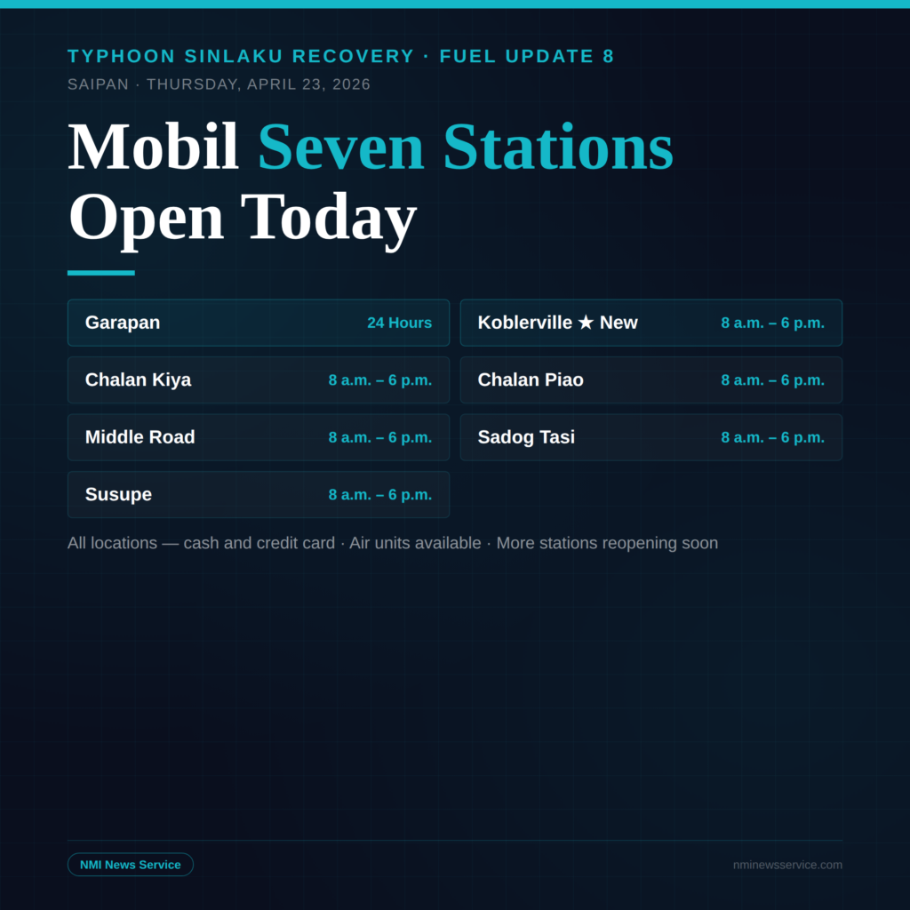 SAIPAN — Mobil has expanded to seven open service stations on Saipan as of Thursday, April 23, adding Mobil Koblerville to its operating locations and extending Mobil Garapan to 24-hour service, according to Media Advisory No. 8 issued Thursday morning.