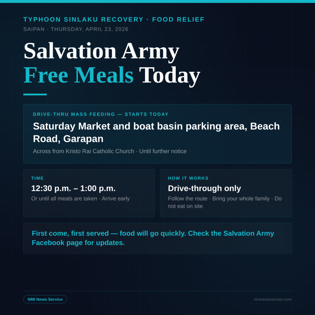 SAIPAN — The Salvation Army Emergency Disaster Services is launching a drive-thru mass feeding distribution beginning today from 12:30 p.m. to 1:00 p.m., or until all meals are taken, at the Saturday Market and boat basin parking areas on Beach Road in Garapan, across from Kristo Rai Catholic Church.