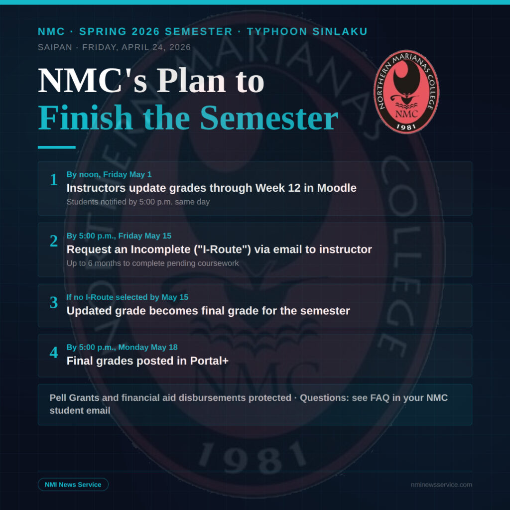 SAIPAN — Northern Marianas College Acting Dean of Academic Programs and Services Ajani Burrell has outlined a four-step approach to concluding the Spring 2026 semester following Typhoon Sinlaku, aiming to balance academic integrity with flexibility for students and instructors dealing with the storm’s aftermath.