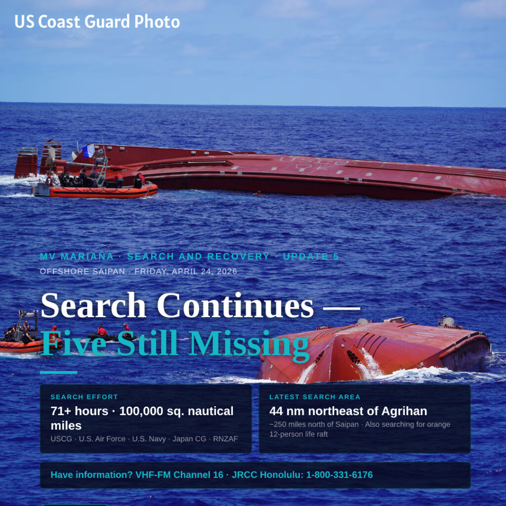 SAIPAN — The U.S. Coast Guard and multinational partners continued searching Friday for the five missing crew members of the cargo vessel Mariana, with search patterns now reaching 44 nautical miles northeast of Agrihan according to Coast Guard Update 5.