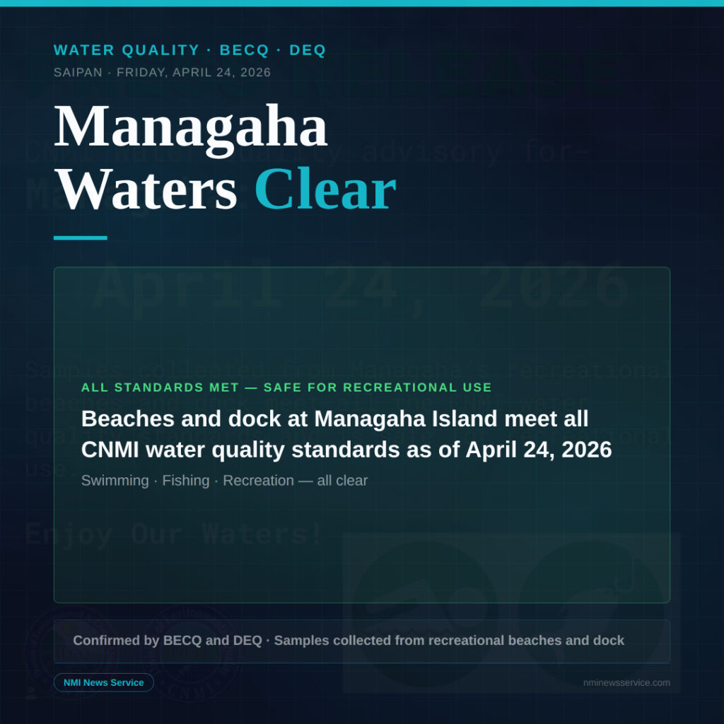 SAIPAN — Water samples collected from Managaha Island’s recreational beaches and dock meet all CNMI water quality standards and are safe for recreational use, the Bureau of Environmental and Coastal Quality and the Division of Environmental Quality announced Friday, April 24.