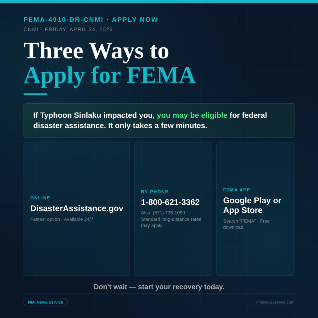 SAIPAN — The CNMI Joint Information Center is urging all residents impacted by Typhoon Sinlaku to apply for federal disaster assistance, with three ways to do so now available following President Trump’s signing of the major disaster declaration.