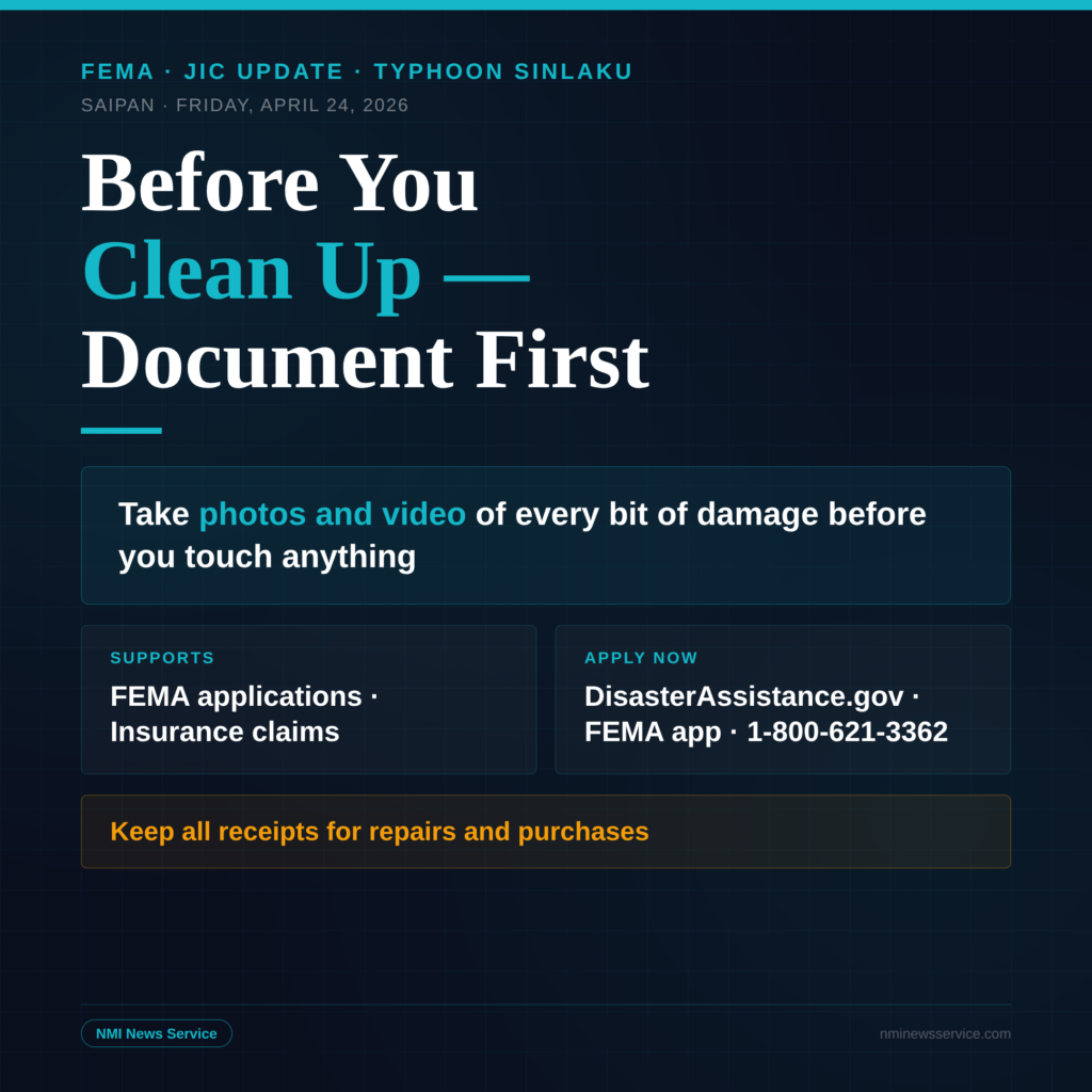 SAIPAN — The CNMI Joint Information Center is urging Typhoon Sinlaku survivors to photograph or video all storm damage before beginning any cleanup, according to a public advisory issued Friday at 5:00 p.m.
