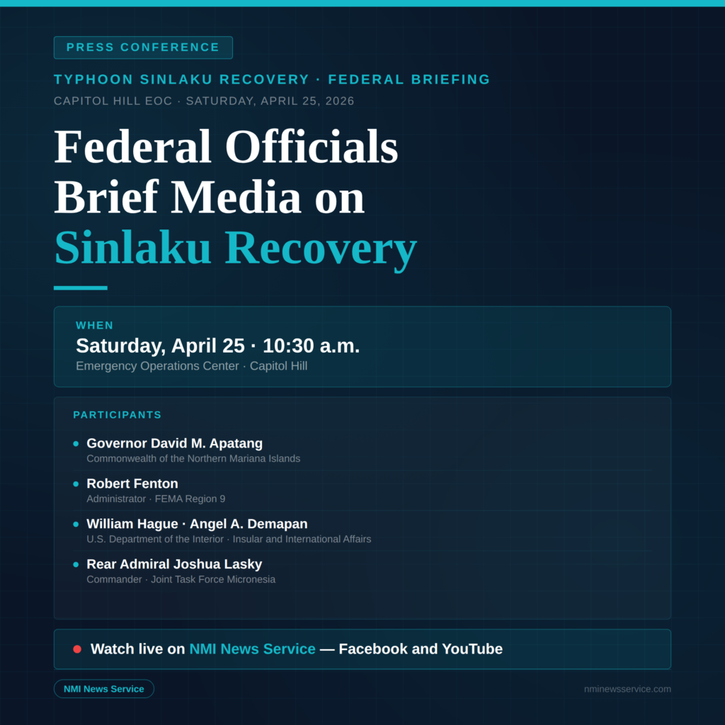 SAIPAN — Governor David M. Apatang will be joined by senior federal officials Saturday morning for a press conference at the Emergency Operations Center on Capitol Hill providing updates on Typhoon Sinlaku response, federal support and ongoing recovery efforts.