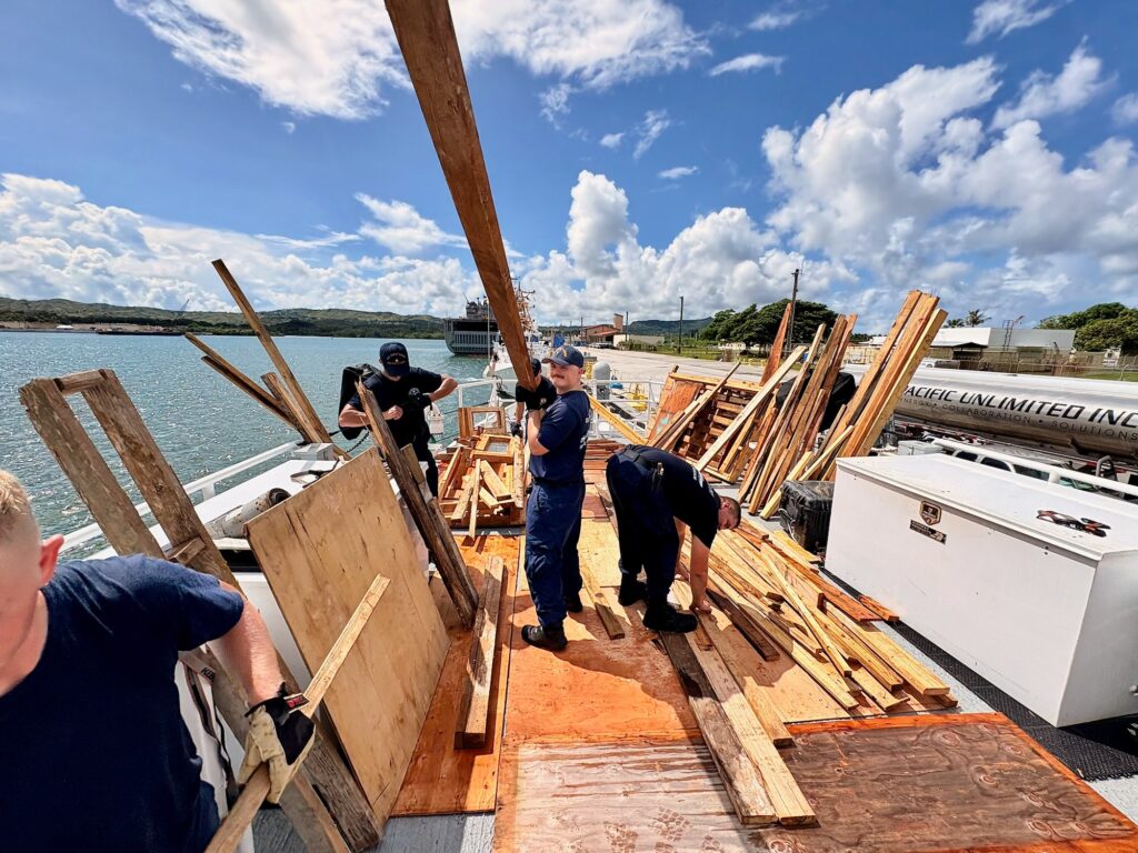 In addition to maritime security, the crew delivered 2,000 pounds of supplies to the remote islands of Sapwuahfik, Nukuoro, and Kapingamarangi. The deliveries were made in partnership with the U.S. Embassy in Kolonia and the Guam-based Ayuda Foundation. Supplies included reclaimed lumber that residents of Kapingamarangi quickly turned into new benches and tables for their community meeting house.