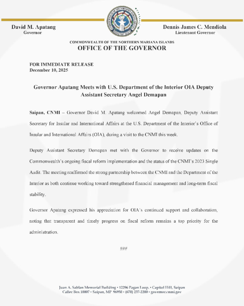 Demapan met with Apatang to receive updates on the Commonwealth’s fiscal reform implementation and the status of the CNMI’s 2023 Single Audit. According to the Governor’s Office, the meeting reaffirmed the partnership between the CNMI and DOI as both work toward strengthened financial management and long-term fiscal stability. Apatang expressed appreciation for OIA’s support and said transparent and timely progress on fiscal reform remains a priority for the administration.