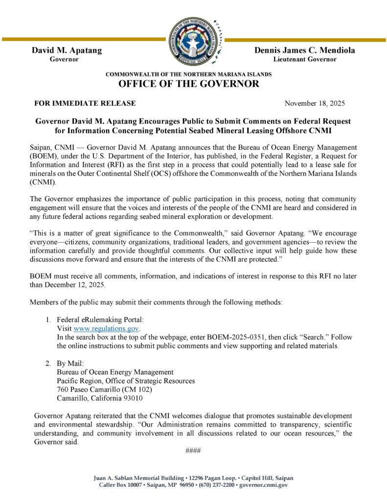 SAIPAN — Governor David M. Apatang is urging residents, community groups, and government agencies to submit comments on a new federal request for information that could lead to seabed mineral leasing offshore the Commonwealth.