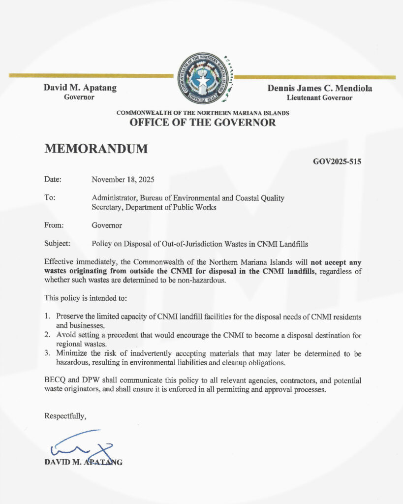 In a Nov. 18 memorandum to the Bureau of Environmental and Coastal Quality (BECQ) administrator and the Department of Public Works (DPW) secretary, Apatang said the Commonwealth “will not accept any wastes originating from outside the CNMI for disposal in the CNMI landfills, regardless of whether such wastes are determined to be non-hazardous.”